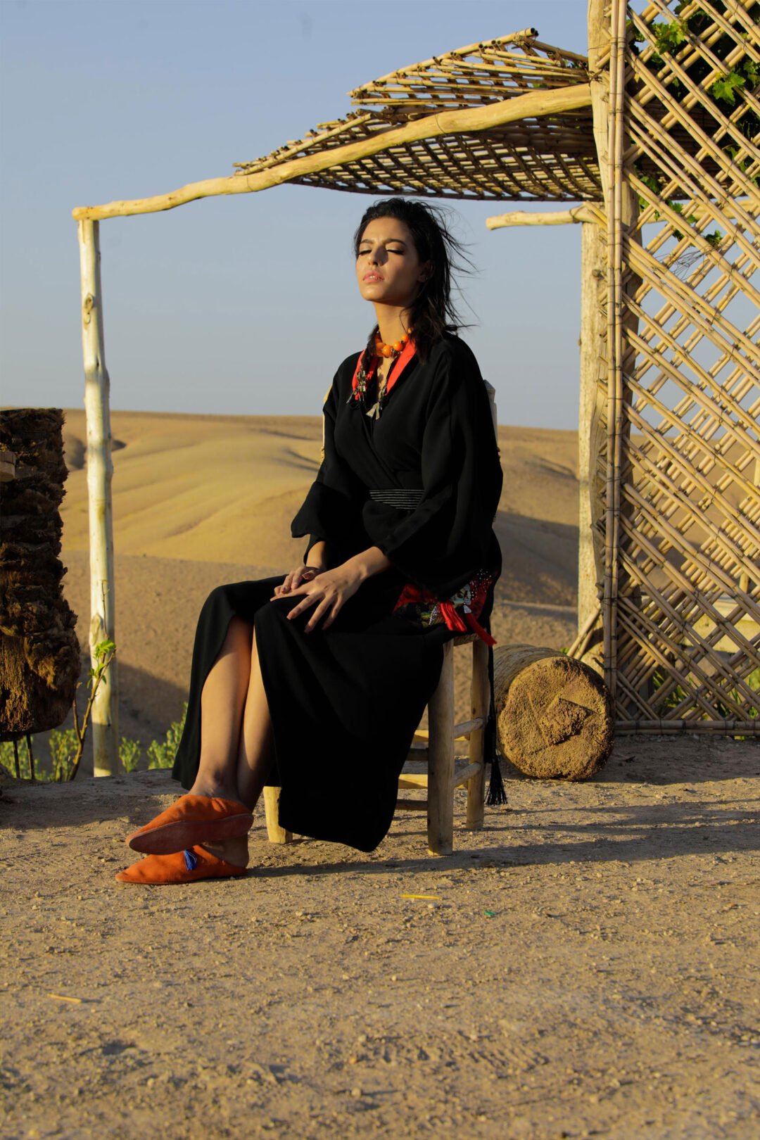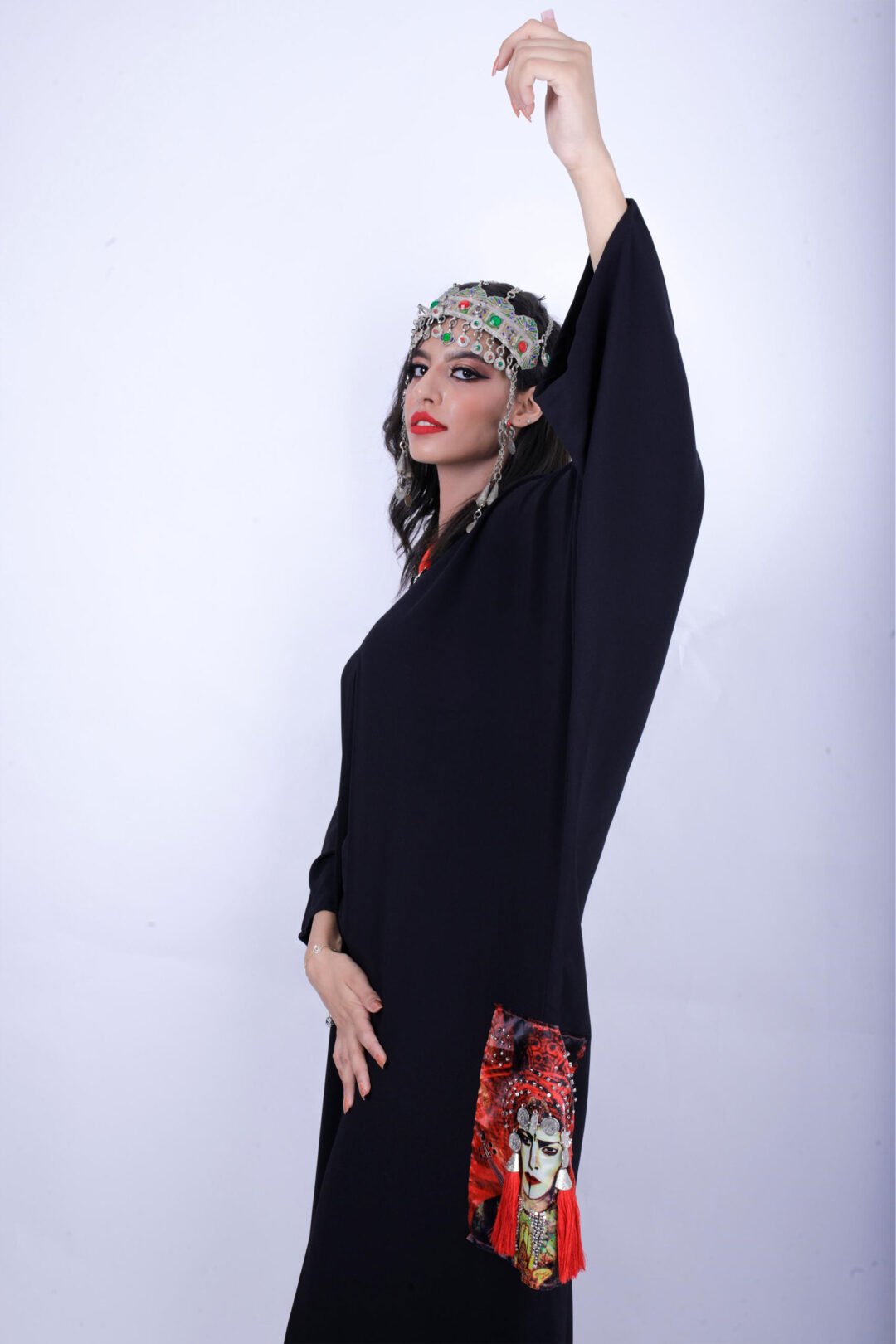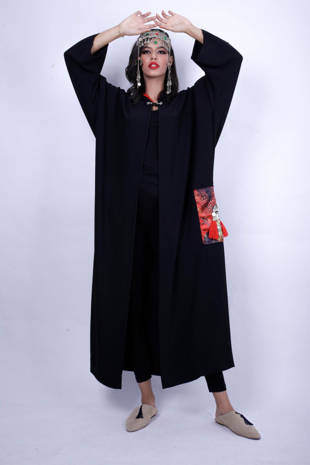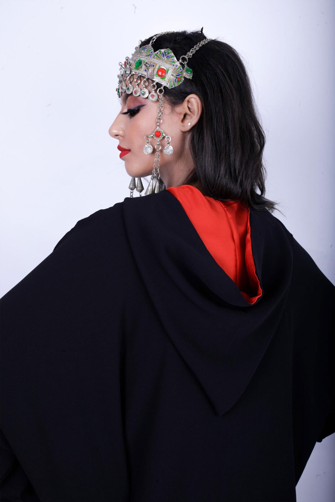 kimono Tissu : crêpe lourd noir , capuche doublé en satin rouge